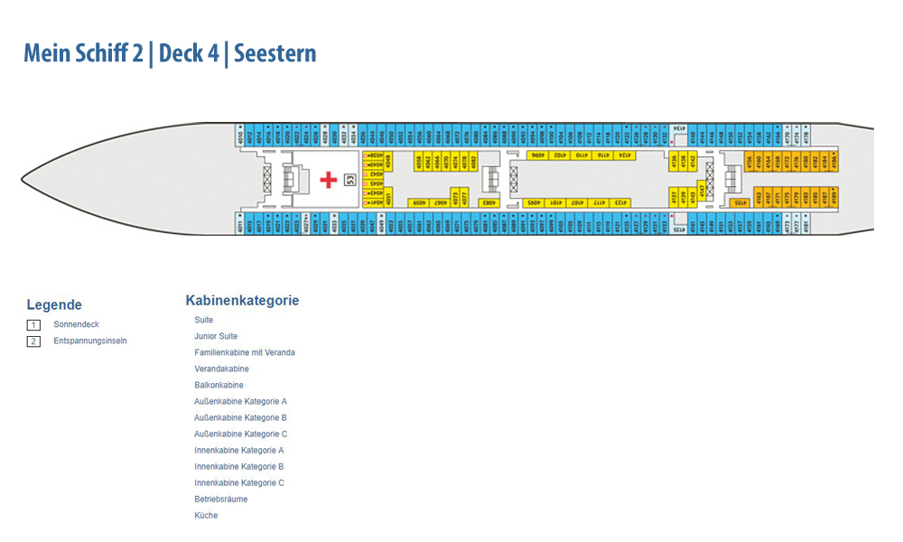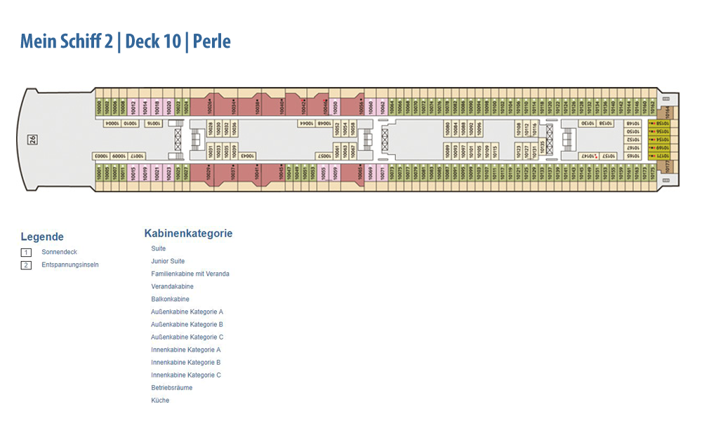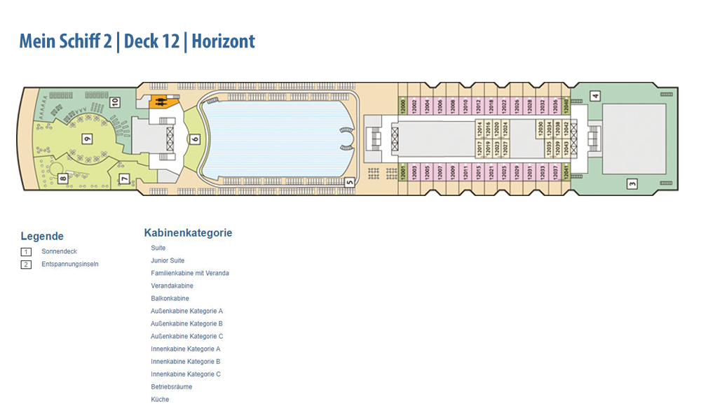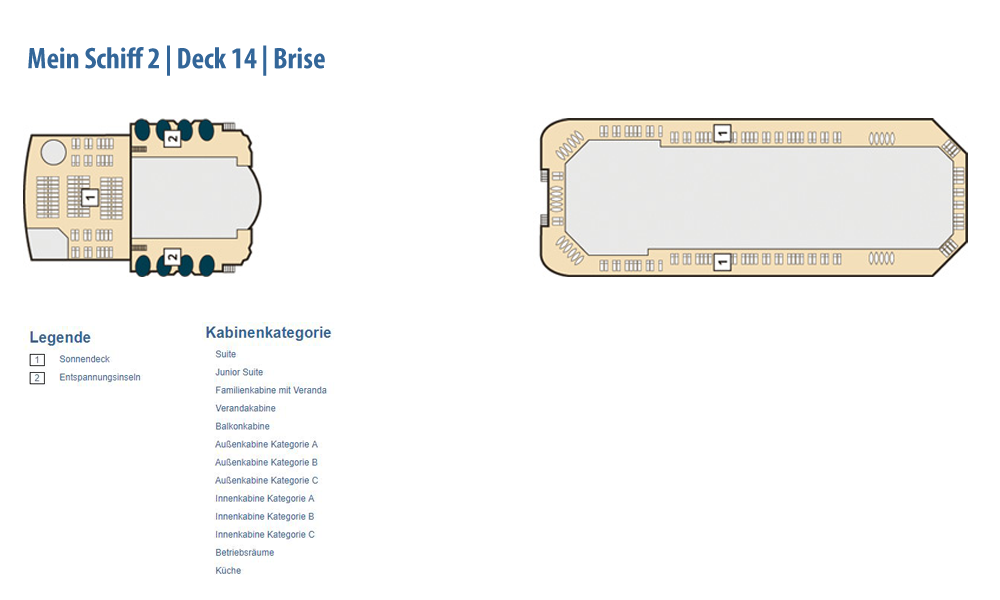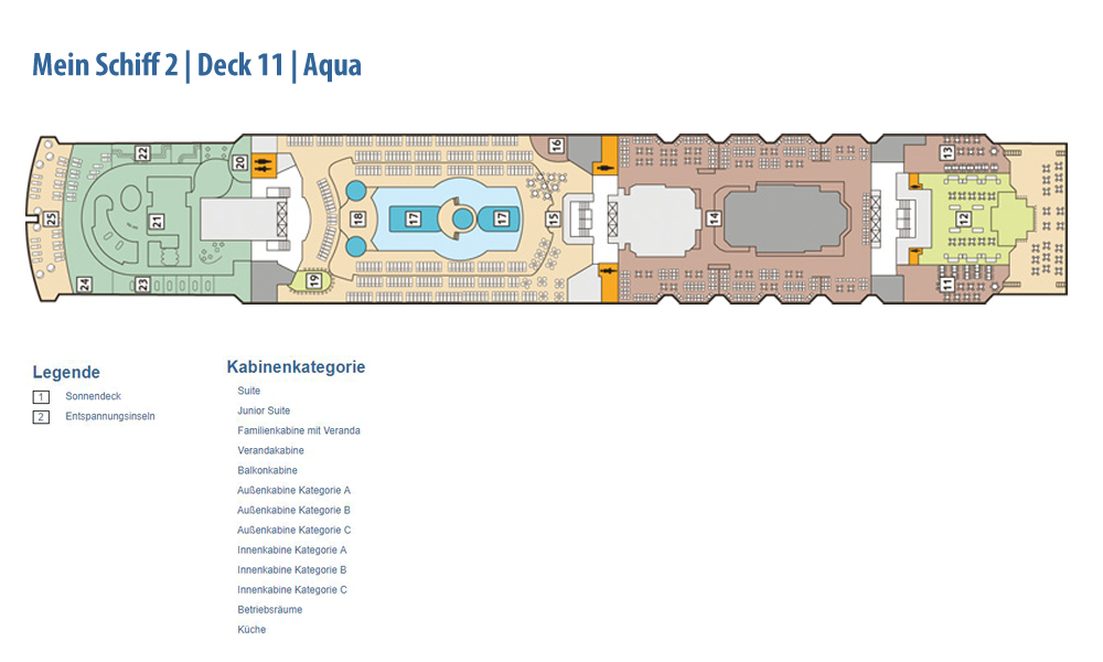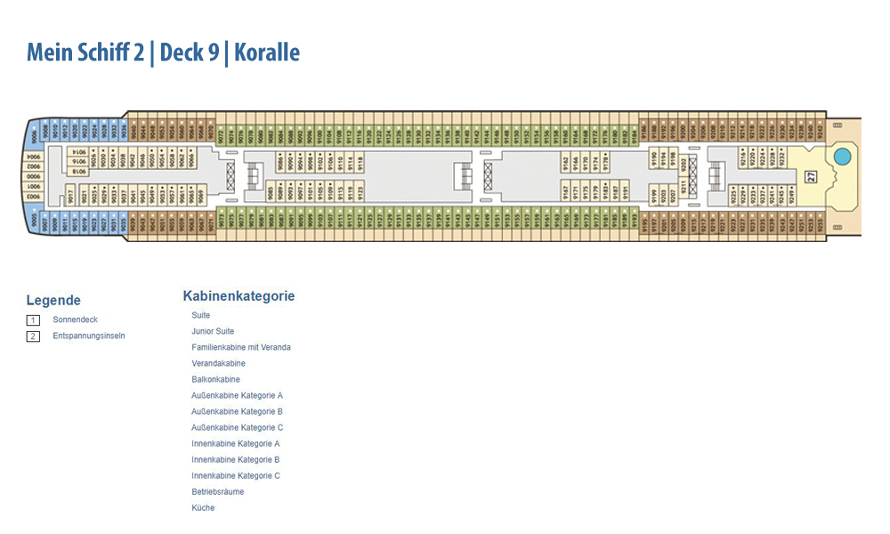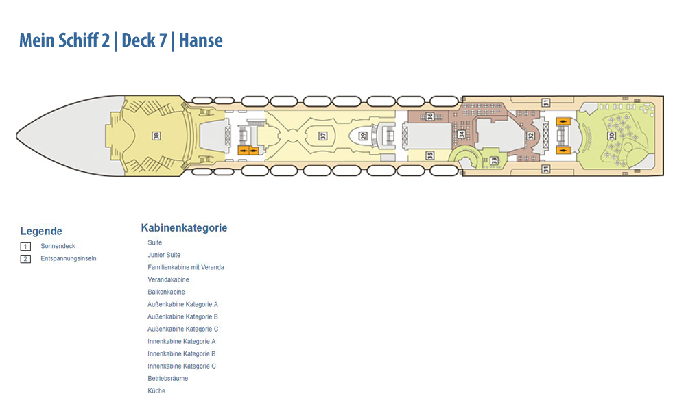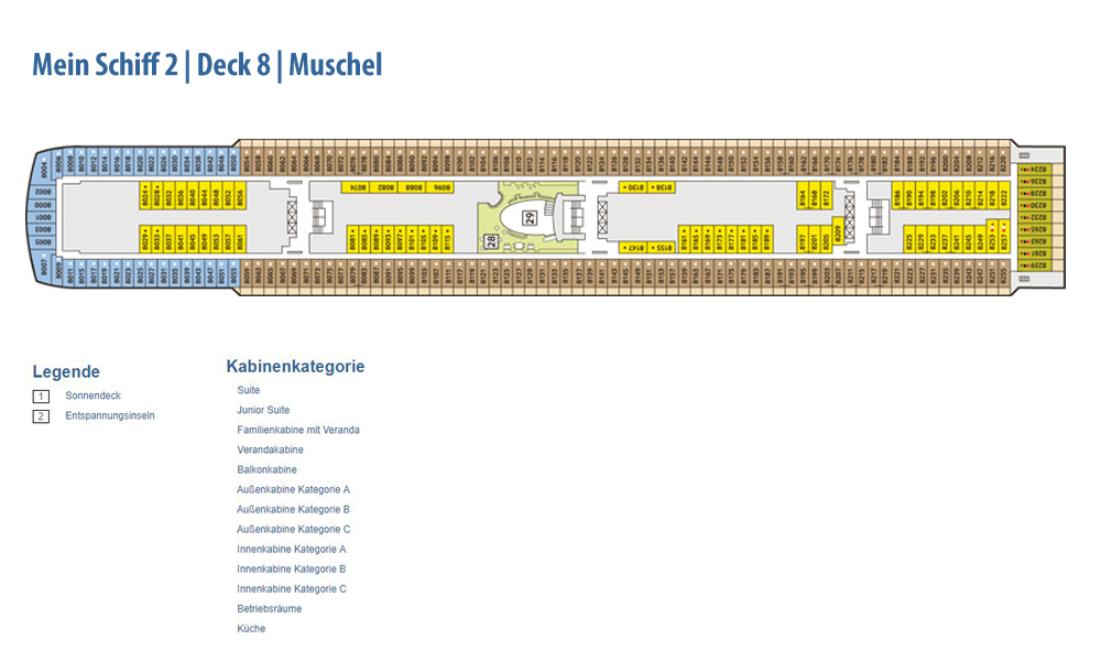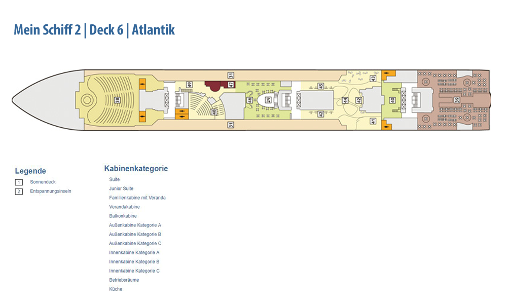 Weitere Informationen folgen in Kürze. Alle Bilder und Fotomontagen zeigen das baugleiche Schwesterschiff, die Neue Mein Schiff 1.Die als Designer-Schiff konzipierte Mein Schiff 2 setzt den Schwerpunkt noch stärker auf bekannte Designgrößen. So konnte mit Werner Aisslinger ein weiterer international renommierter Designer gewonnen werden. Zusammen mit seinem Team gestaltete er das Tag & Nacht Bistro sowie die Schaubar neu. Insgesamt gaben fünf verschiedene Architekten und Designer dem Neubau seinen besonderen Schliff. Wie schon auf der Mein Schiff 1 sind die Suiten von Star-Designerin Patricia Urquiola gestaltet. Ebenfalls mit an Bord sind wieder die Architekturbüros Tillberg, 3Deluxe und cmDesign. Die Kabinen haben ein neues Design erhalten und den Gästen stehen vier neue Kategorien an Suiten zur Verfügung: insgesamt 1.447 Kabinen, davon 158 Innenkabinen (davon 2 barrierefrei), 127 Außenkabinen (davon 4 barrierefrei), 1056 Balkonkabinen (davon 4 barrierefrei), 2 Premium Verandakabinen, 66 Junior-Suiten und 38 Suiten. Freuen Sie sich auf 12 Restaurants und Bistros, 15 Bars und Longes, freundlichst verteilt auf 16 Decks! Neben dieser größeren Auswahl an Kabinen und Suiten ist auch die Mein Schiff 2 ein echtes Sport- und Wellness-Schiff. Sport & SPA Möglichkeiten: Neben dem bekannten und beliebten 25-Meter-Pool bieten die Sportbereiche noch mehr Möglichkeiten als je zuvor, die Fläche der Außendecks beträgt stolze 20.500 qm!